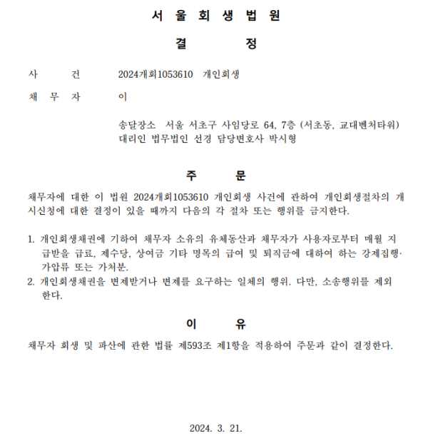 개인회생신청사건의 금지명령결정문