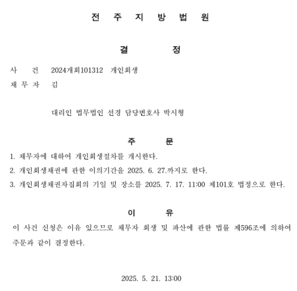 개인회생신청사건의 개시결정문