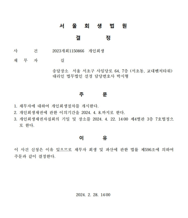 개인회생신청사건의 개시결정문