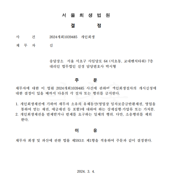 개인회생신청사건의 금지명령결정문