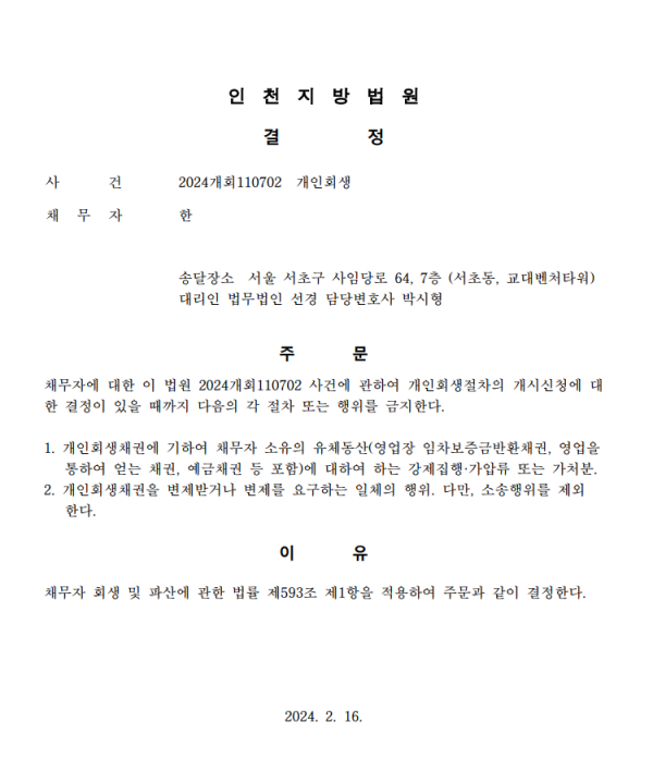개인회생신청사건의 금지명령결정문