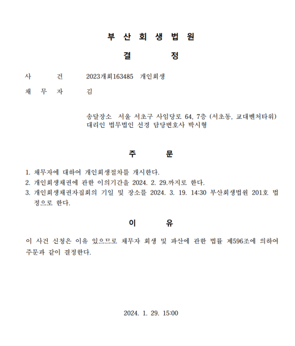 개인회생신청사건의 개시결정문