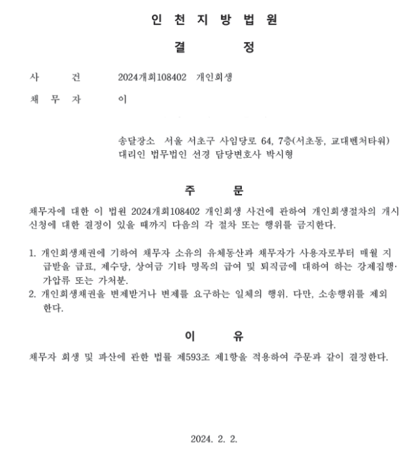 개인회생신청사건의 금지명령결정문