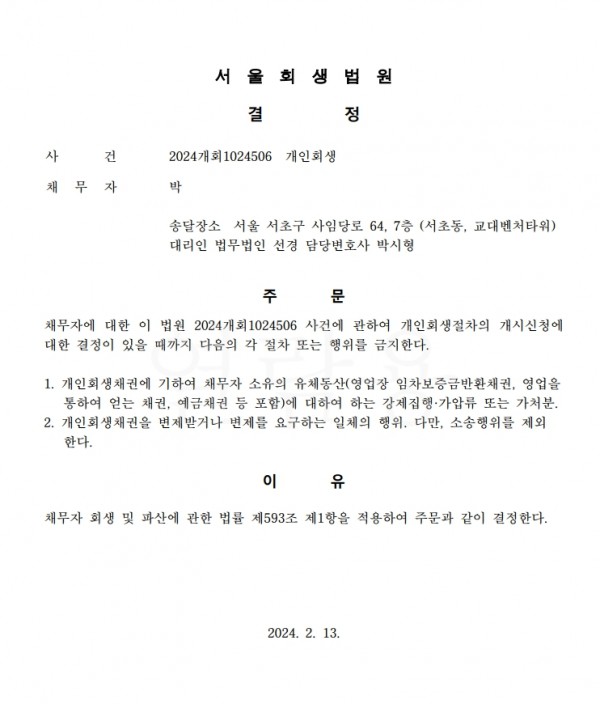 개인회생신청사건의 금지명령결정문