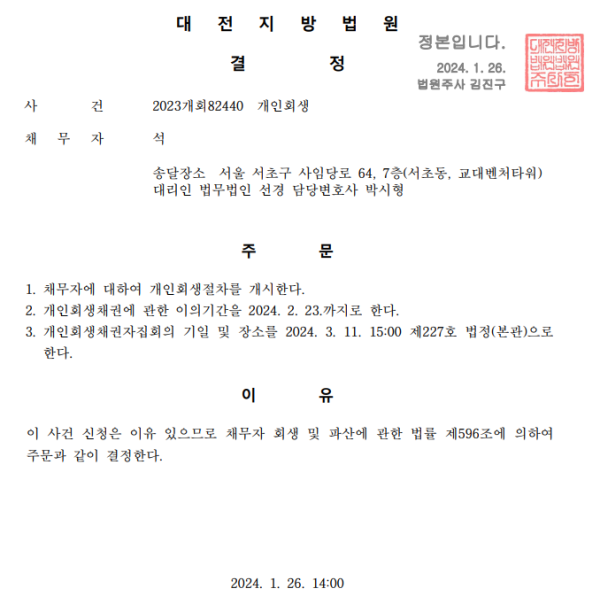 개인회생신청사건의 개시결정문