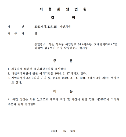 개인회생신청사건의 개시결정문