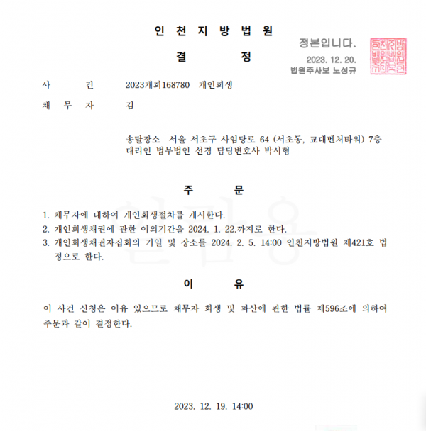 개인회생신청사건의 개시결정문