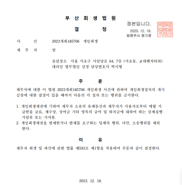 개인회생신청사건의 금지명령결정문