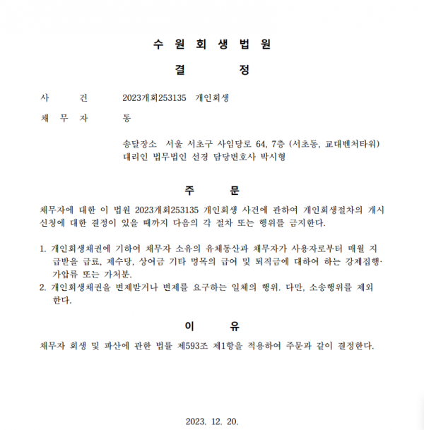 개인회생신청사건의 금지명령결정문