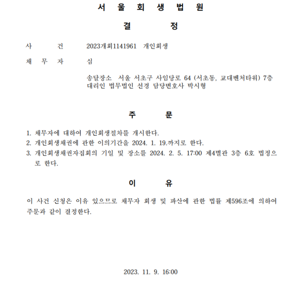 개인회생신청사건의 개시결정문