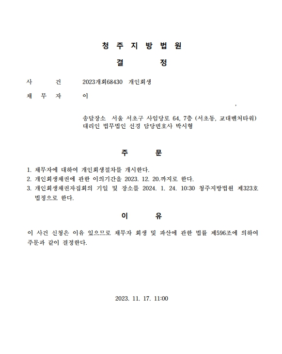 개인회생신청사건의 개시결정문