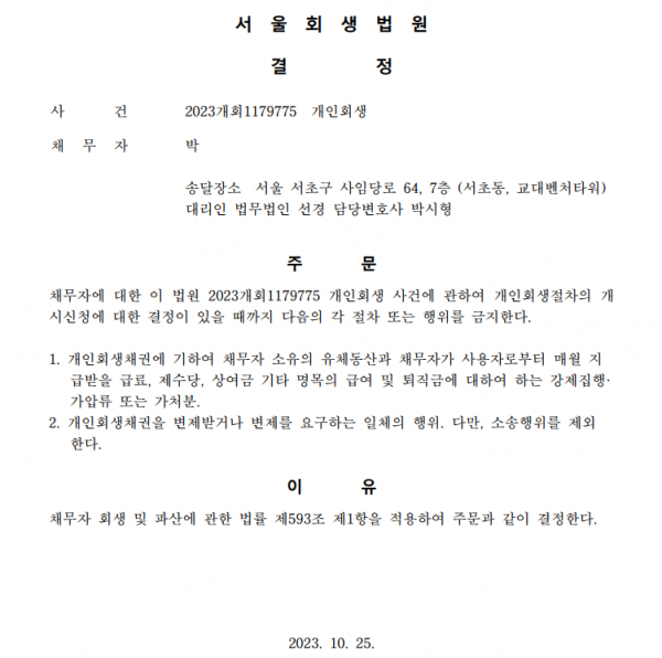 개인회생신청사건의 금지명령결정문