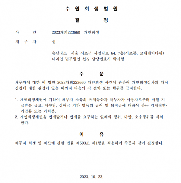 개인회생신청사건의 금지명령결정문