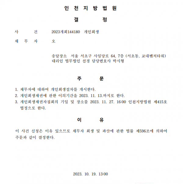 개인회생신청사건의 개시결정문