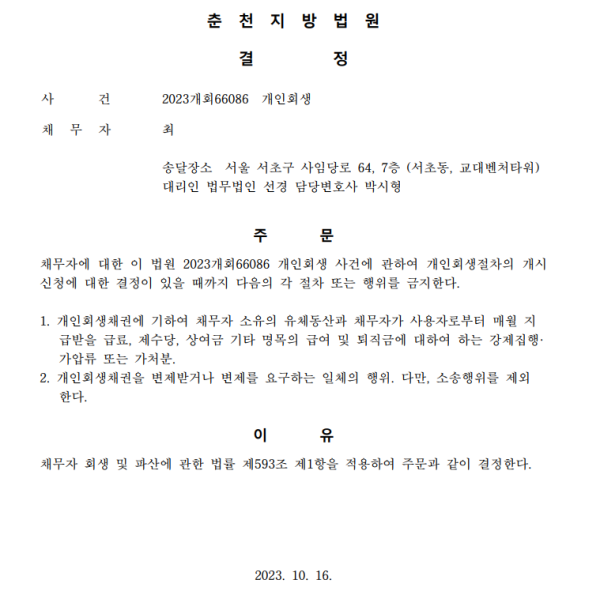 개인회생신청사건의 금지명령결정문