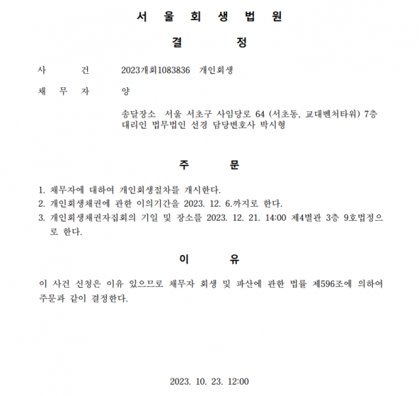 개인회생신청사건의 개시결정문