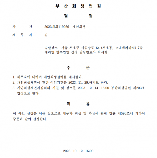 개인회생신청사건의 개시결정문