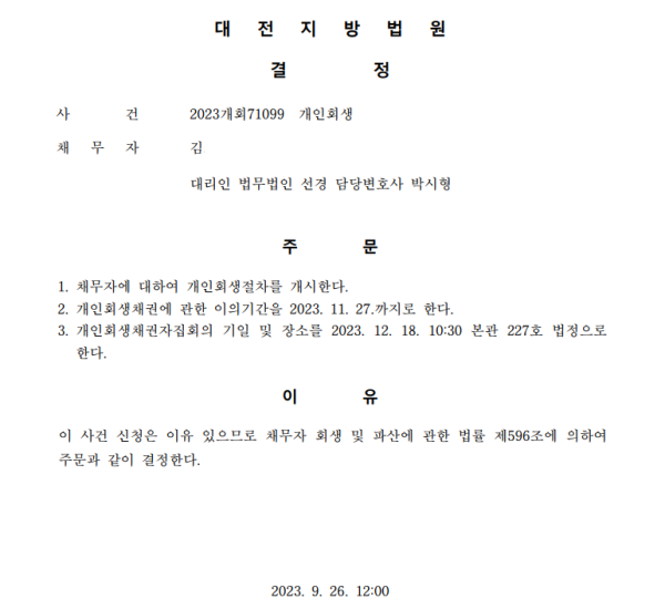 개인회생신청사건의 개시결정문