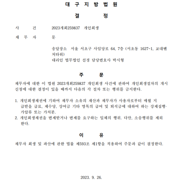 개인회생신청사건의 금지명령결정문