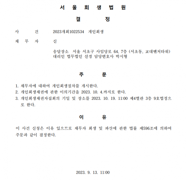 개인회생신청사건의 개시결정문