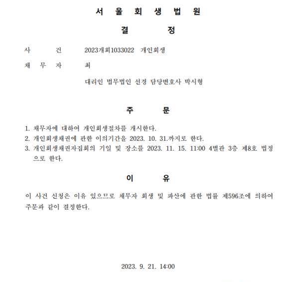개인회생신청사건의 개시결정문