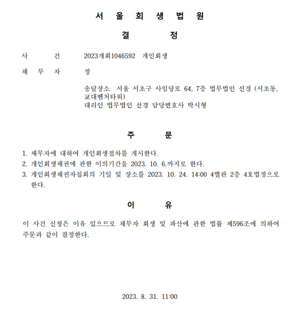 개인회생신청사건의 개시결정문