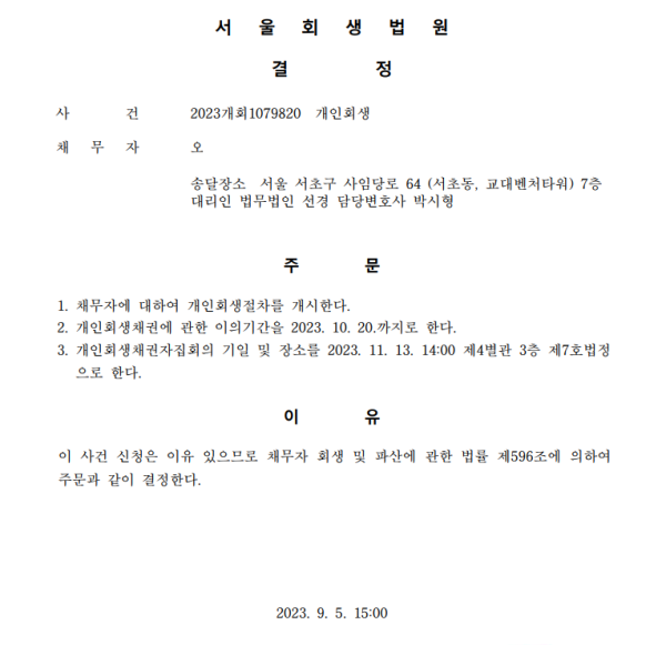 개인회생신청사건의 개시결정문