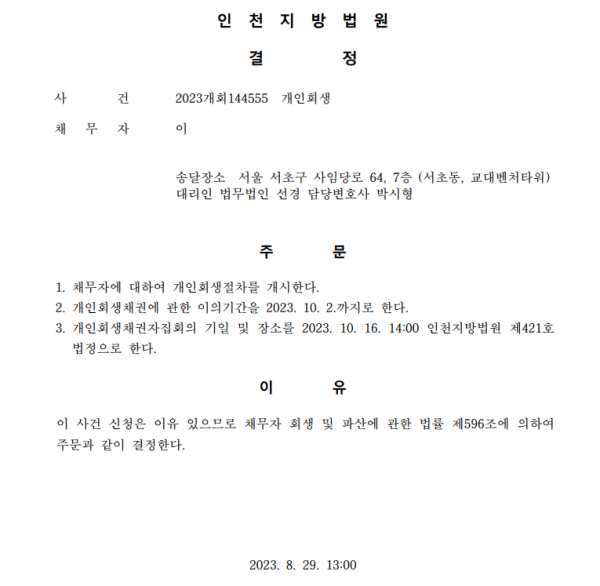 개인회생신청사건의 개시결정문