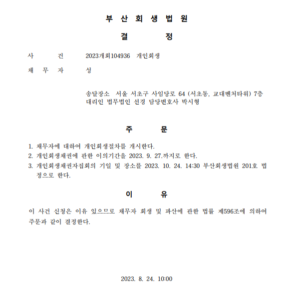 개인회생신청사건의 개시결정문