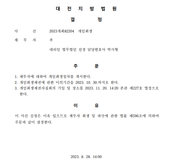 개인회생신청사건의 개시결정문