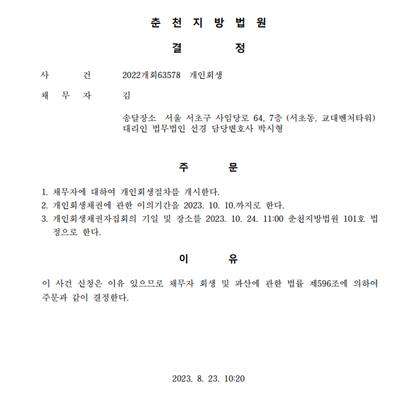 개인회생신청사건의 개시결정문