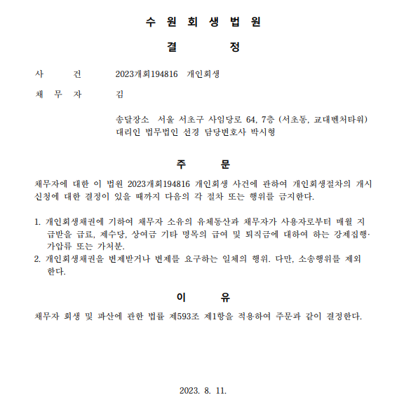 개인회생신청사건의 금지명령결정문