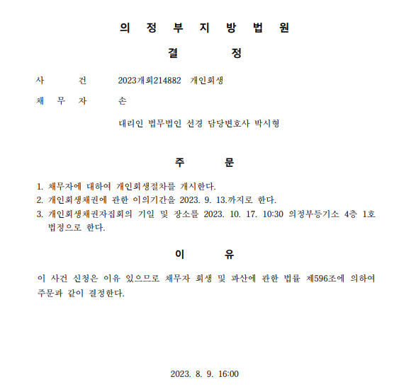 개인회생신청사건의 개시결정문