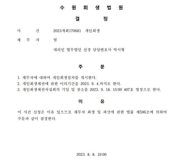 개인회생신청사건의 개시결정문