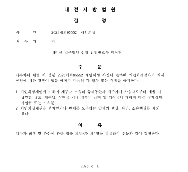 개인회생신청사건의 금지명령결정문