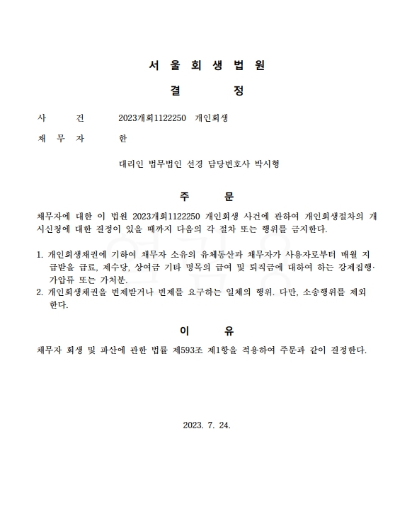 개인회생신청사건의 금지명령결정문