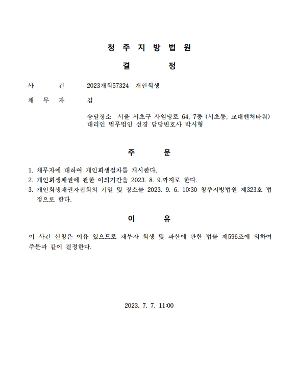개인회생신청사건의 개시결정문