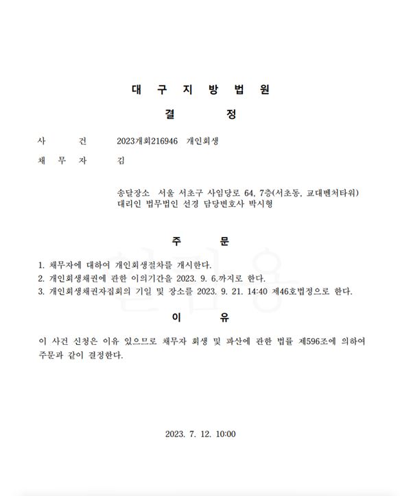 개인회생신청사건의 개시결정문