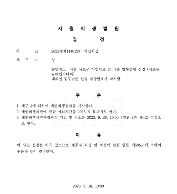개인회생신청사건의 개시결정문