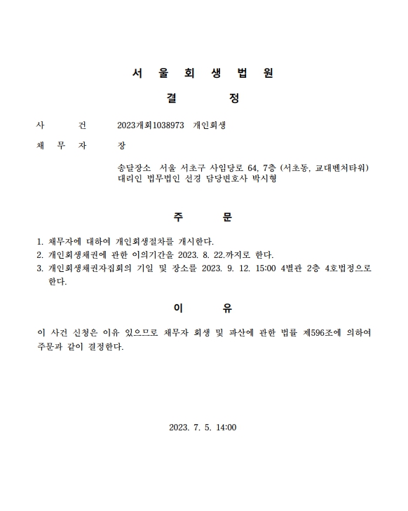 개인회생신청사건의 개시결정문