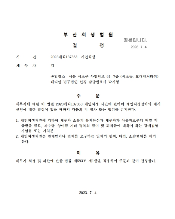 개인회생신청사건의 금지명령결정문
