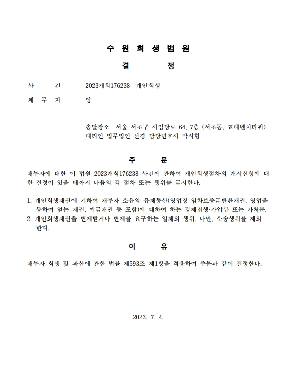 개인회생신청사건의 금지명령결정문