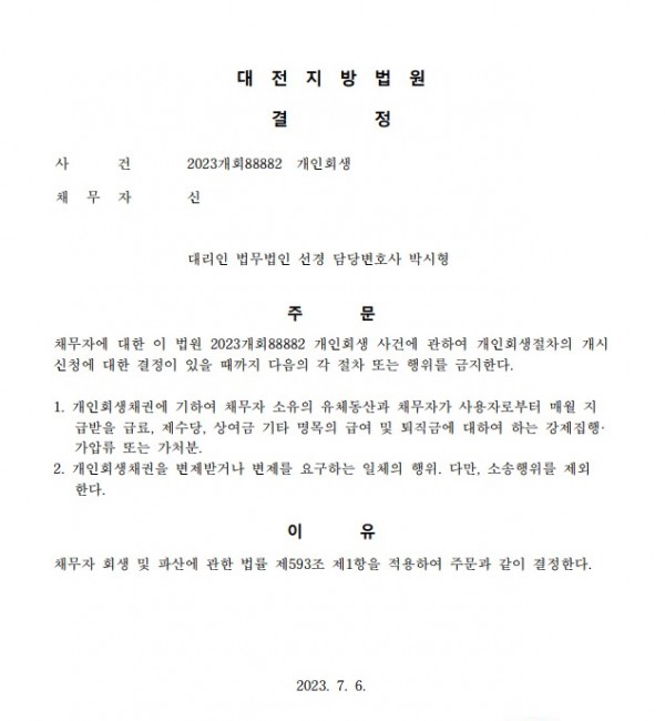 개인회생신청사건의 금지명령결정문