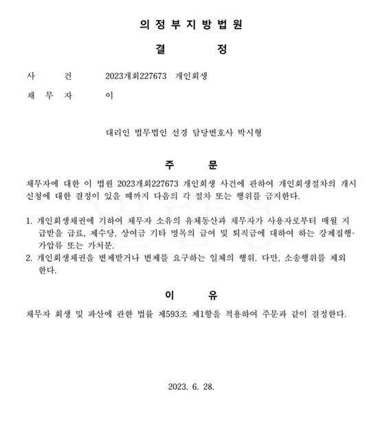 개인회생신청사건의 금지명령결정문