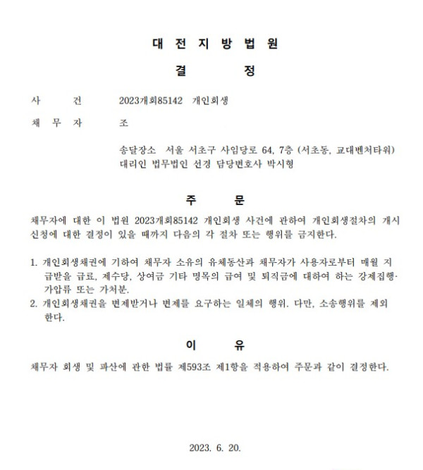 개인회생신청사건의 금지명령결정문