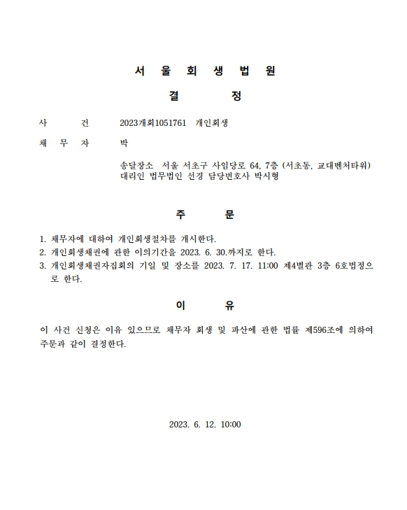 개인회생신청사건의 개시결정문