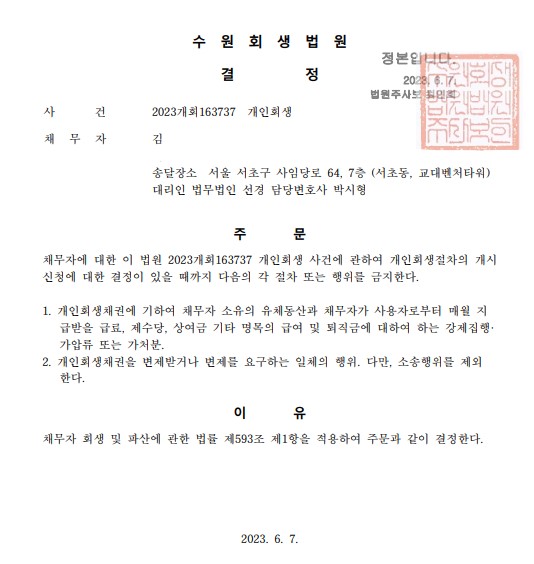 개인회생신청사건의 금지명령결정문