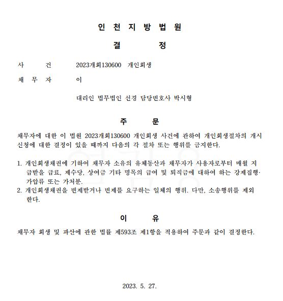 개인회생신청사건의 금지명령결정문