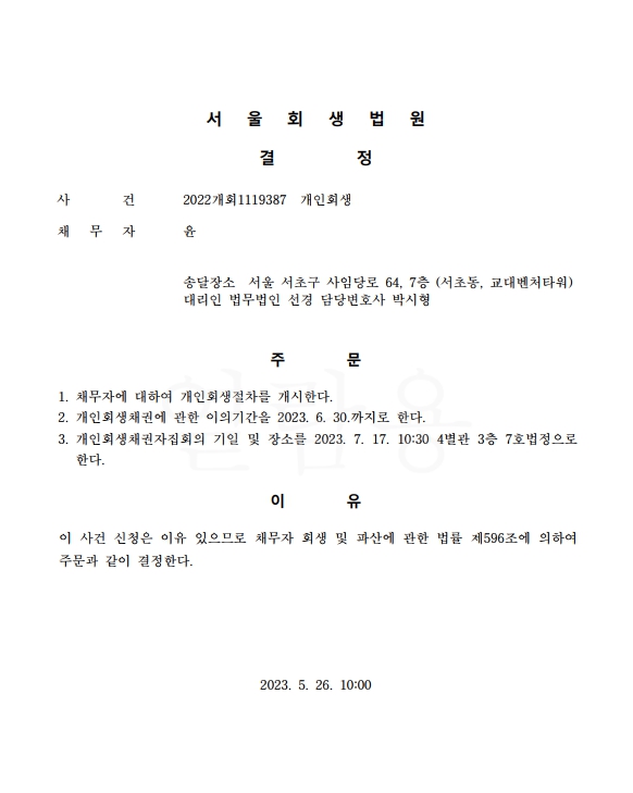 개인회생신청사건의 개시결정문