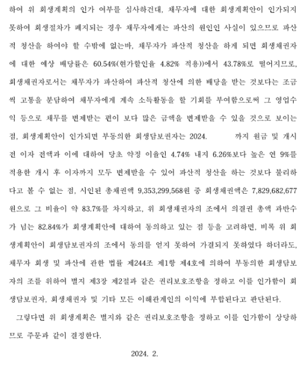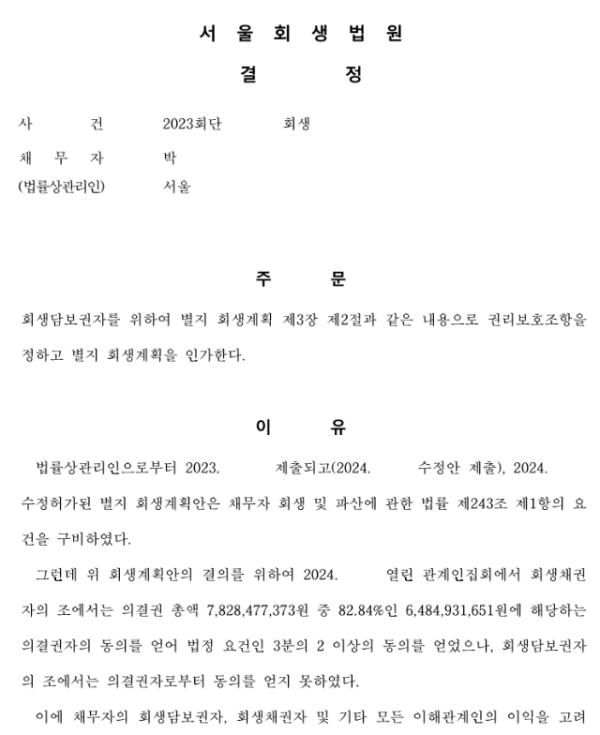 서울회생법원 일반회생신청사건의 강제인가결정문